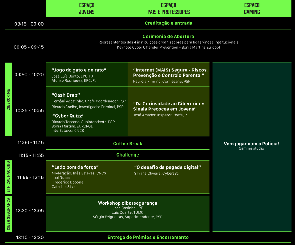 Para além de diversos desafios, será uma oportunidade para ouvir pessoas inspiradoras da área de cibersegurança, da polícia e da indústria de jogos, identificar percursos académicos e oportunidades de trabalho nas áreas TIC. O destaque do dia é o desafio hacker, onde os participantes poderão testar as suas capacidades e ganhar prémios.